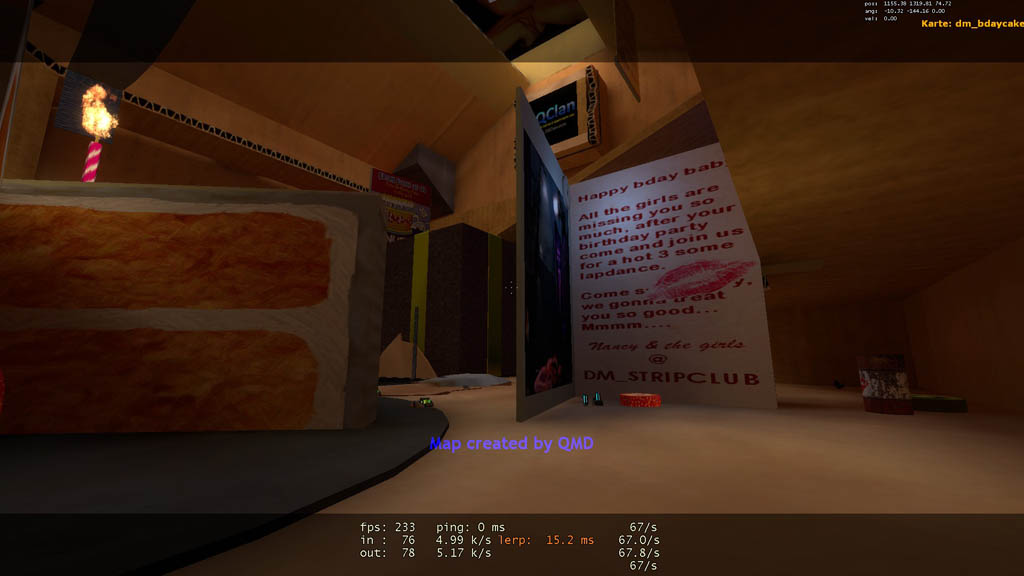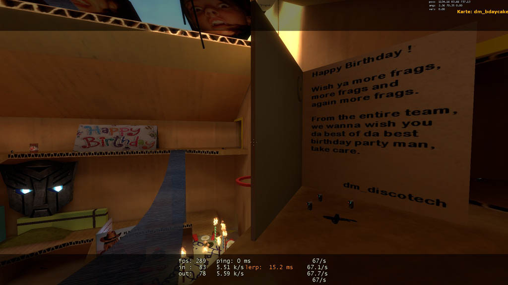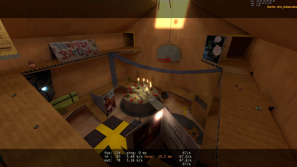 Map Title : BIRTHDAY CAKE Map Name (file) : dm_bdaycake.bsp Map Version : 1.0 Author : QMD Steam profile page : http://steamcommunity.com/id/QMD/ E-mail : mike_lounge@hotmail.com ================================================================================ Game : Half-Life 2 Supported game type : deathmatch Map size : 12 players Custom Textures : Yes Custom Soundscape : Yes Custom Models : No Custom Skybox : No Map rating : for anyone |